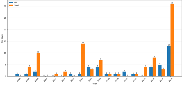 Şekil 2: Türkiye’de Okul Silahlı Saldırılarında Ölen ve Yaralananların Sayısı (2000-2026)